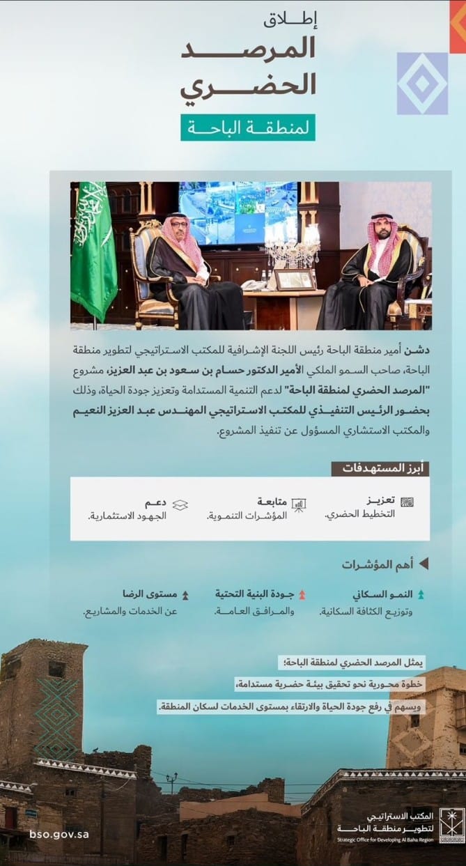 دشن أمير منطقة الباحة رئيس اللجنة الاشرافية للمكتب_الاستراتيجي_لتطوير_منطقة_الباحة ، صاحب السمو الملكي الأمير الدكتور حسام بن سعود بن عبد العزيز، مشروع “المرصد الحضري لمنطقة الباحة” لدعم التنمية المستدامة وتعزيز جودة الحياة، وذلك بحضور الرئيس التنفيذي للمكتب الاستراتيجي المهندس عبد العزيز النعيم و فريق العمل.
