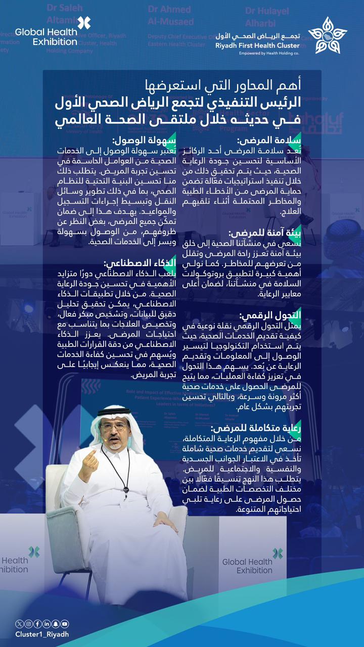 استعرض الرئيس التنفيذي لتجمع الرياض الصحي الأول د. صالح التميمي، خلال مشاركته في ملتقى الصحة العالمي، مجموعة من المحاور الرئيسية التي تعكس التزام التجمع بتطوير الرعاية الصحية وتحقيق أهداف رؤية المملكة 2030. وتناول في حديثه عدة جوانب هامة في مسيرة التحول الصحي التي يقودها التجمع.