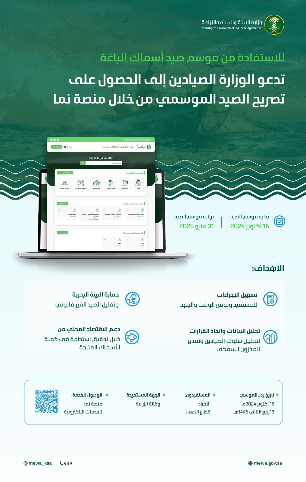 دعت وزارة البيئة والمياه والزراعة جميع الصيادين للاستفادة من موسم صيد أسماك الباغة الذي انطلق في 16 أكتوبر 2024م ويستمر حتى 31 مايو 2025م، وذلك من خلال الحصول على تصريح الصيد الموسمي عبر منصة “نما” التابعة للوزارة.