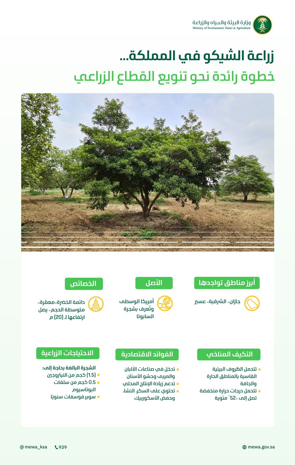 وأوضحت الوزارة أن الشيكو إحدى أشجار السابوتا وموطنها الأصلي أمريكا الوسطى وهي شجرة مستديمة الخضرة متوسطة الحجم معمرة ومتوسطة الحجم، يصل ارتفاعها إلى (20) مترًا، وتدخل ثمارها في عدة صناعات مثل صناعة الألبان وحشو الأسنان، مما يعزز من القيمة الاقتصادية لهذه الزراعة، مضيفة أن الشجرة تتكيف بشكل كبير مع الظروف البيئية في المملكة، حيث تنمو في المناطق الجافة والحارة، وتتحمل درجات حرارة منخفضة تصل إلى ( -52) درجة مئوية.