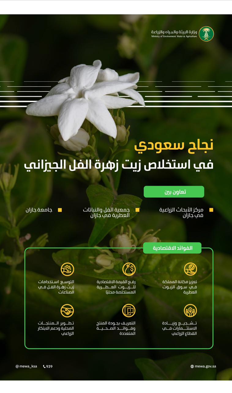 كشفت وزارة البيئة والمياه والزراعة عن نجاح مركز الأبحاث الزراعية بجازان بالتعاون مع جمعية الفل وجامعة جازان في استخلاص زيت زهرة الفل الجيزاني، وهي خطوة طموحة تعزز من القيمة الاقتصادية والاجتماعية لهذا المنتج العطري الفريد.