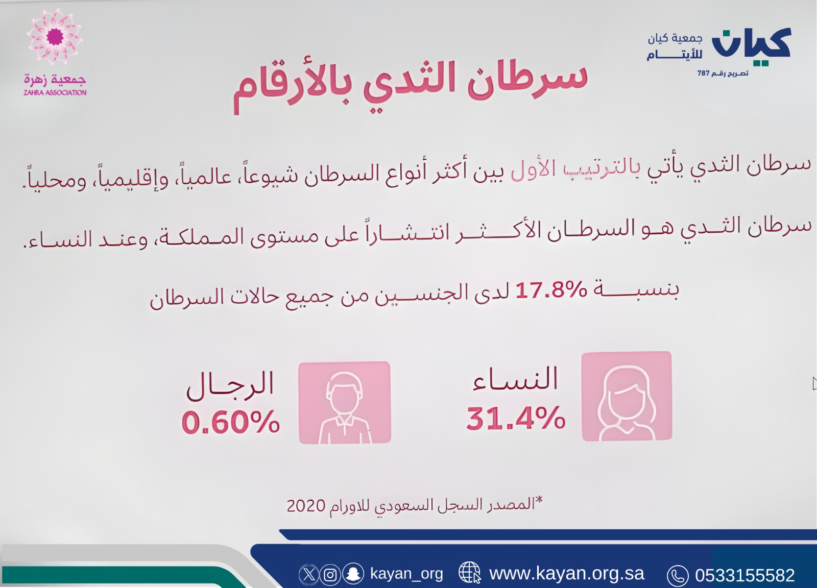 تجدر الإشارة أنه حرصا من جمعية “كيان” للأيتام على صحة مستفيديها ولأنهم “غاليين عليها” شاركت خلال شهر أكتوبر الوردي بالتوعية بسرطان الثدي مع جمعية زهرة بتوزيع البروشورات التوعوية والشريط الوردي عليهم وعلى موظفات الجمعية ، وأكدت على ضرورة الكشف المبكر وأهميته في سرعة العلاج والسيطرة عليه قبل الانتشار، كما بادرت كيان بالتعاون مع الجمعية السعودية الخيرية لمكافحة السرطان بزيارة المستفيدات لمركز عبد اللطيف بهدف الكشف المبكر وإجراء الفحوصات وتوفير الرعاية الصحية اللازمة لهم كما شجعت مستفيديها على التطوع تعزيزًا لروح العطاء والمشاركة الاجتماعية.