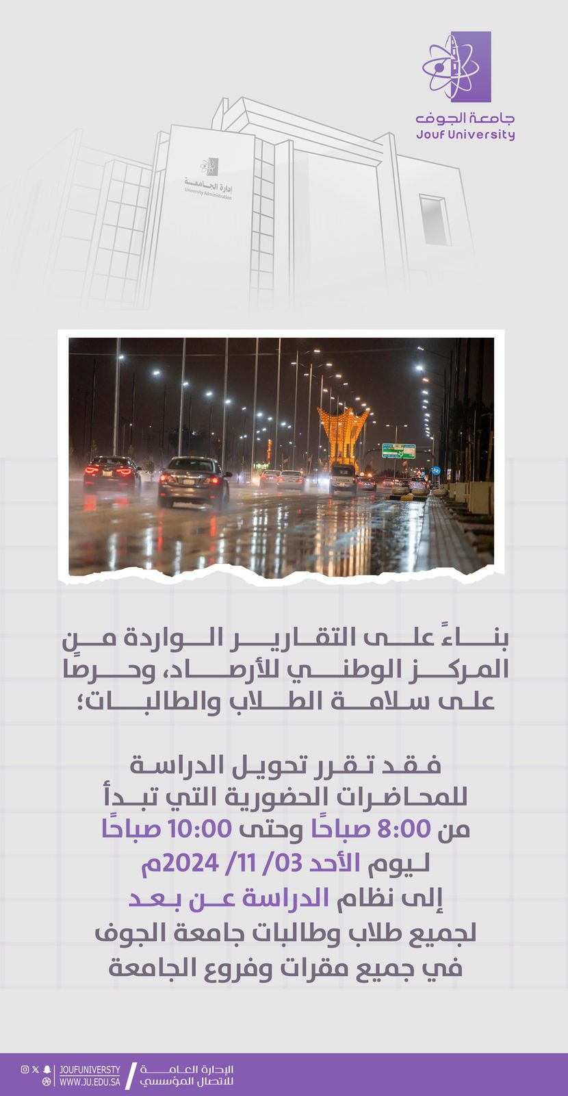 بناءً على التقارير الواردة من المركز الوطني للأرصاد، وحرصًا على سلامة الطلاب والطالبات؛ فقد تقرر تحويل الدراسة للمحاضرات الحضورية التي تبدأ من 8:00 صباحًا وحتى 10:00 صباحًا ليوم الأحد 03-11-2024م إلى نظام الدراسة عن بعد لجميع طلاب وطالبات جامعة الجوف، في جميع مقرات وفروع الجامعة.