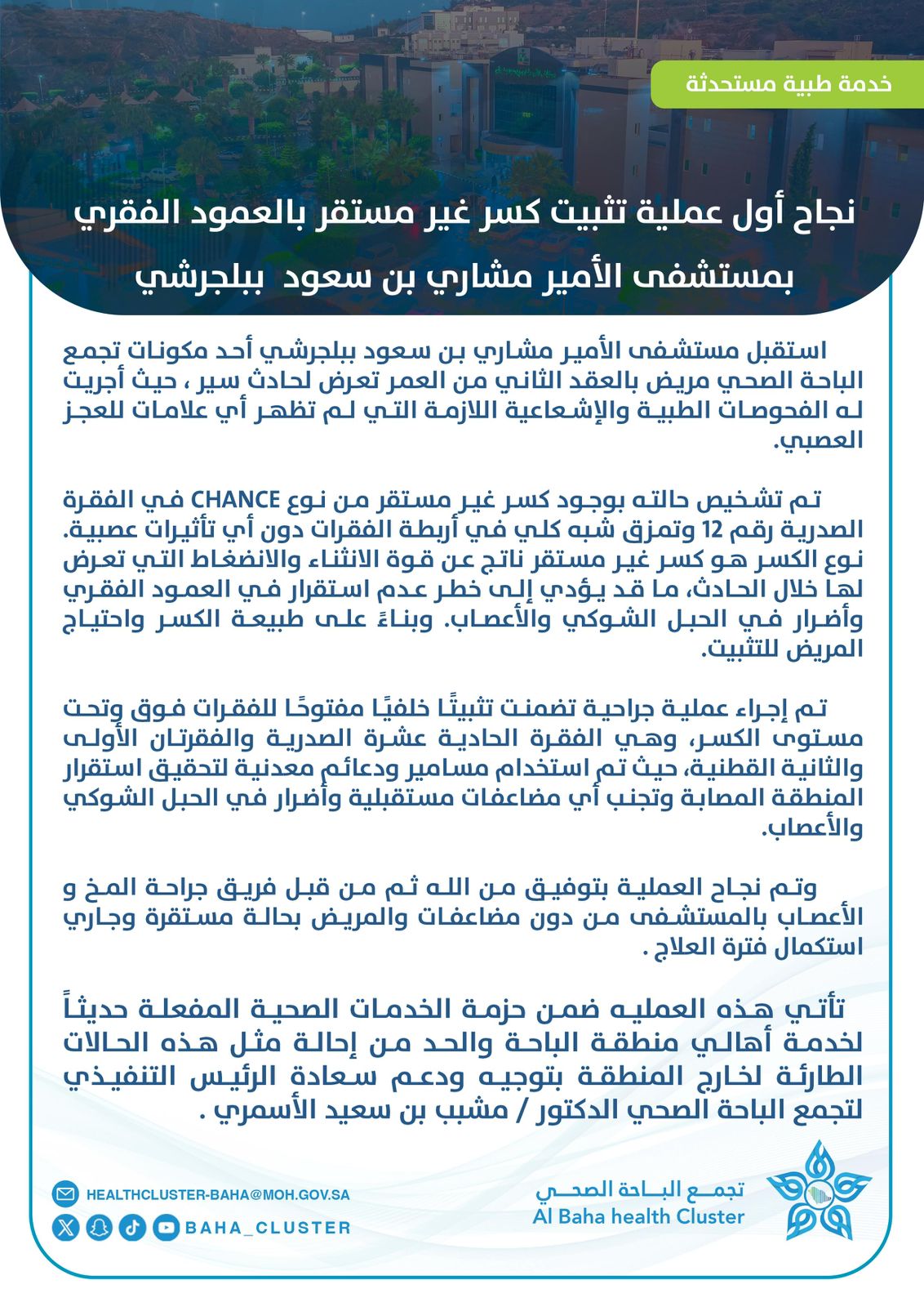 تأتي هذه العمليه ضمن حزمة الخدمات الصحية المفعلة حديثاً لخدمة أهالي منطقة الباحة والحد من إحالة مثل هذه الحالات الطارئة لخارج المنطقة بتوجيه ودعم سعادة الرئيس التنفيذي لتجمع الباحة الصحي الدكتور / مشبب بن سعيد الأسمري .