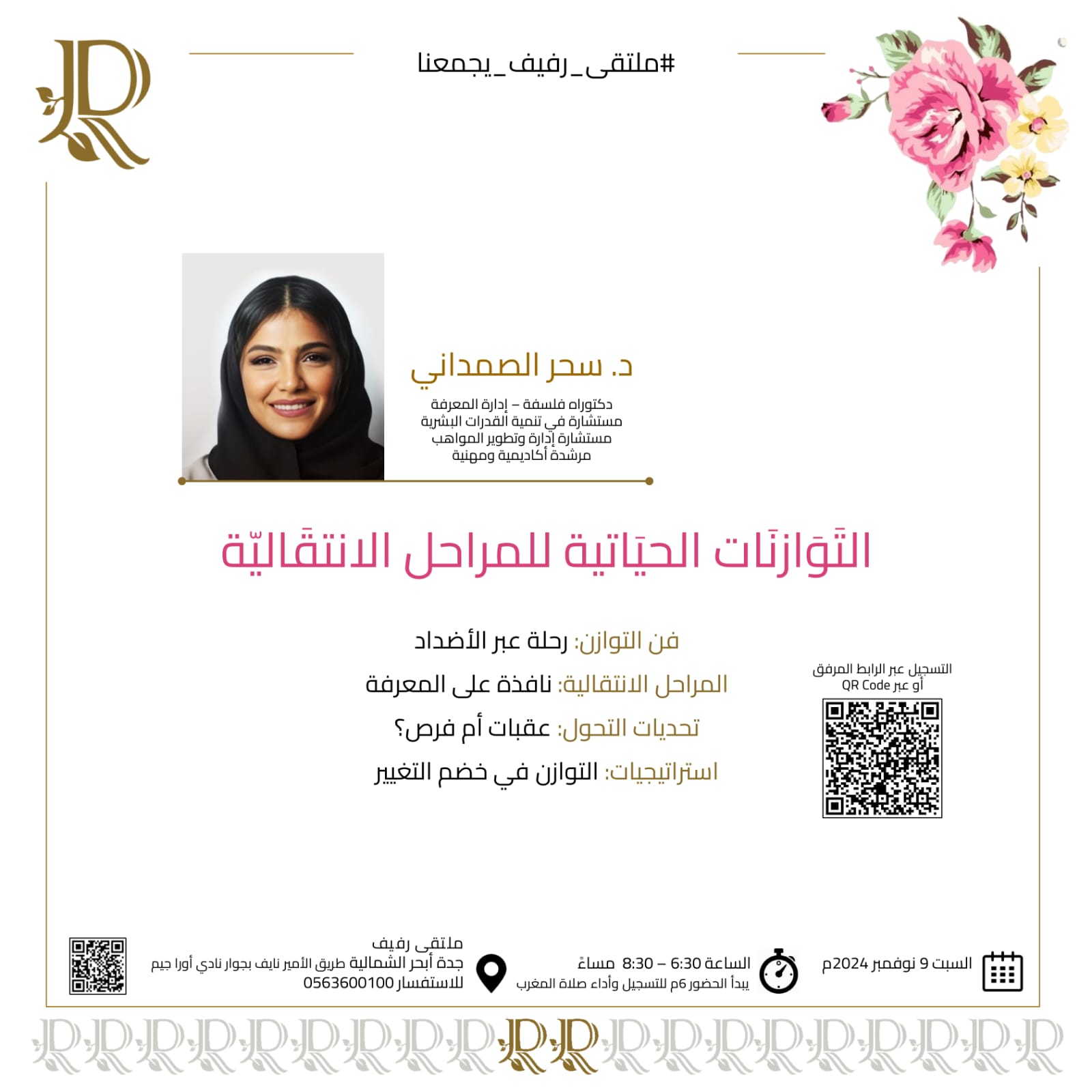 حول هذا اللقاء، قالت: هو لقاء فلسفي عن كيفية تحقيق التوازن في حياتنا، وكيف يمكن لكل تغيير أو تحول أن يصبح فرصة للنمو والتطور إن تم فهمه باستراتيجيات عقلية و روحية وأدوات علمية، وسنستكشف معًا الأفكار الفلسفية التي تعيد تشكيل نظرتنا للواقع وتساعدنا على فهم أن التحديات هي جزء أساسي من رحلة الحياة. ثم تساءلت بعمق فكري: هل أنت مستعد لتغيير منظورك؟، وأوضحت: دعونا نغوص في أعماق الأفكار ونكتشف كيف يمكن للمعرفة أن تكون مرشداً لنا في مواجهة تقلبات الحياة، فقد يكون هذا اللقاء نقطة تحول للجميع نحو رؤية المراحل الانتقالية كفرص لقفزات نوعية للتغيير الإيجابي.