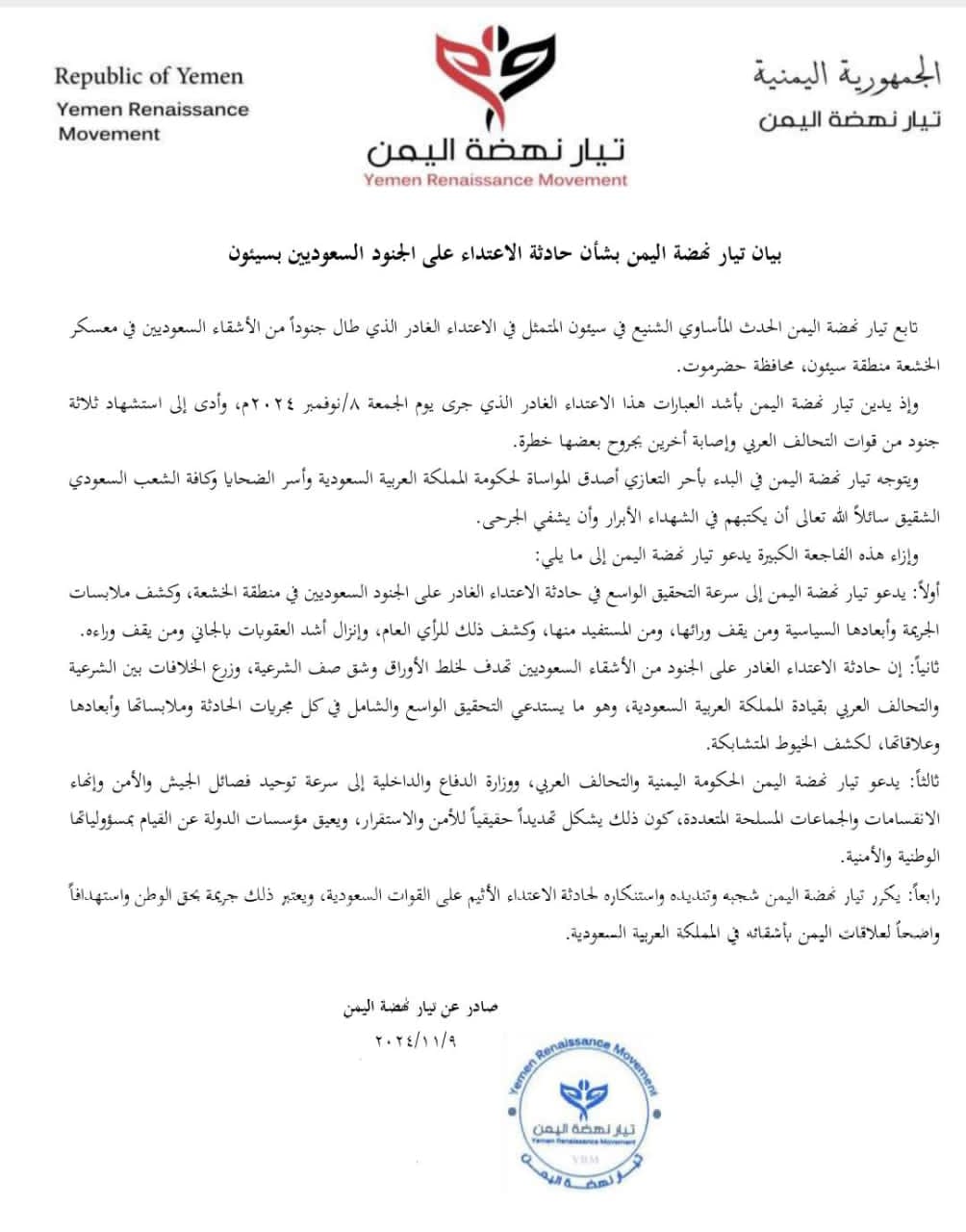أصدر تيار نهضة اليمن بيانًا شديد اللهجة يدين فيه بشدة حادثة الاعتداء التي استهدفت جنودًا من الأشقاء السعوديين في معسكر الخشعة في مدينة سيئون بمحافظة حضرموت، والتي وقعت، يوم أمس الجمعة، وأسفرت عن استشهاد ثلاثة جنود من قوات التحالف العربي وإصابة آخرين بجروح خطيرة.