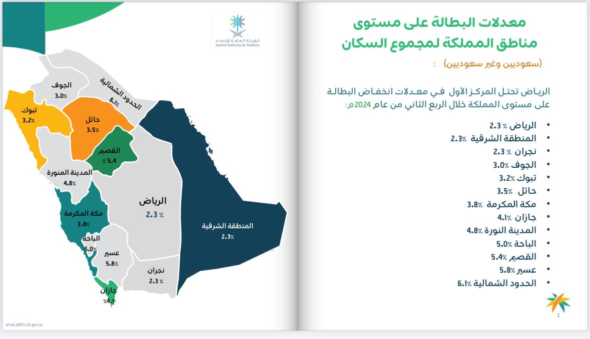 كما احتلت منطقة الرياض المركز الأول في معدلات انخفاض البطالة على مستوى المملكة حيث بلغت نسبة الانخفاض 2.3%.