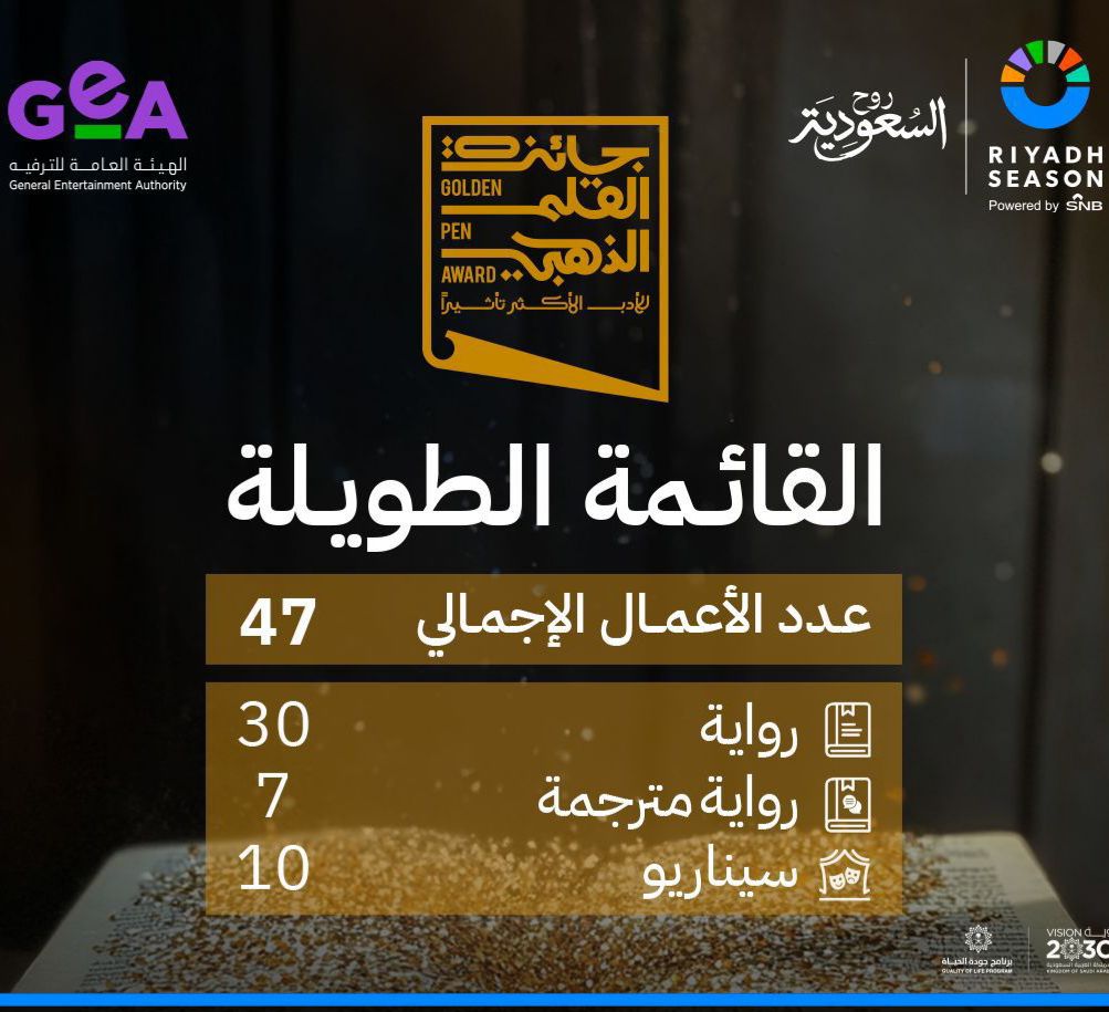 وقد تضمنت القائمة 47 عملاً موزعة على عدة فئات رئيسية تهدف إلى تكريم الإبداع الأدبي والفني في العالم العربي، حيث جاءت فئة “الرواية” في المقدمة بواقع 30 عملاً، تليها فئة “الرواية المترجمة” بسبعة أعمال، ثم فئة “السيناريو” بعشرة أعمال. ويمكن الاطلاع على قائمة الأعمال المشاركة من خلال زيارة الموقع الالكتروني للجائزةhttps://goldenpenaward.com/ar