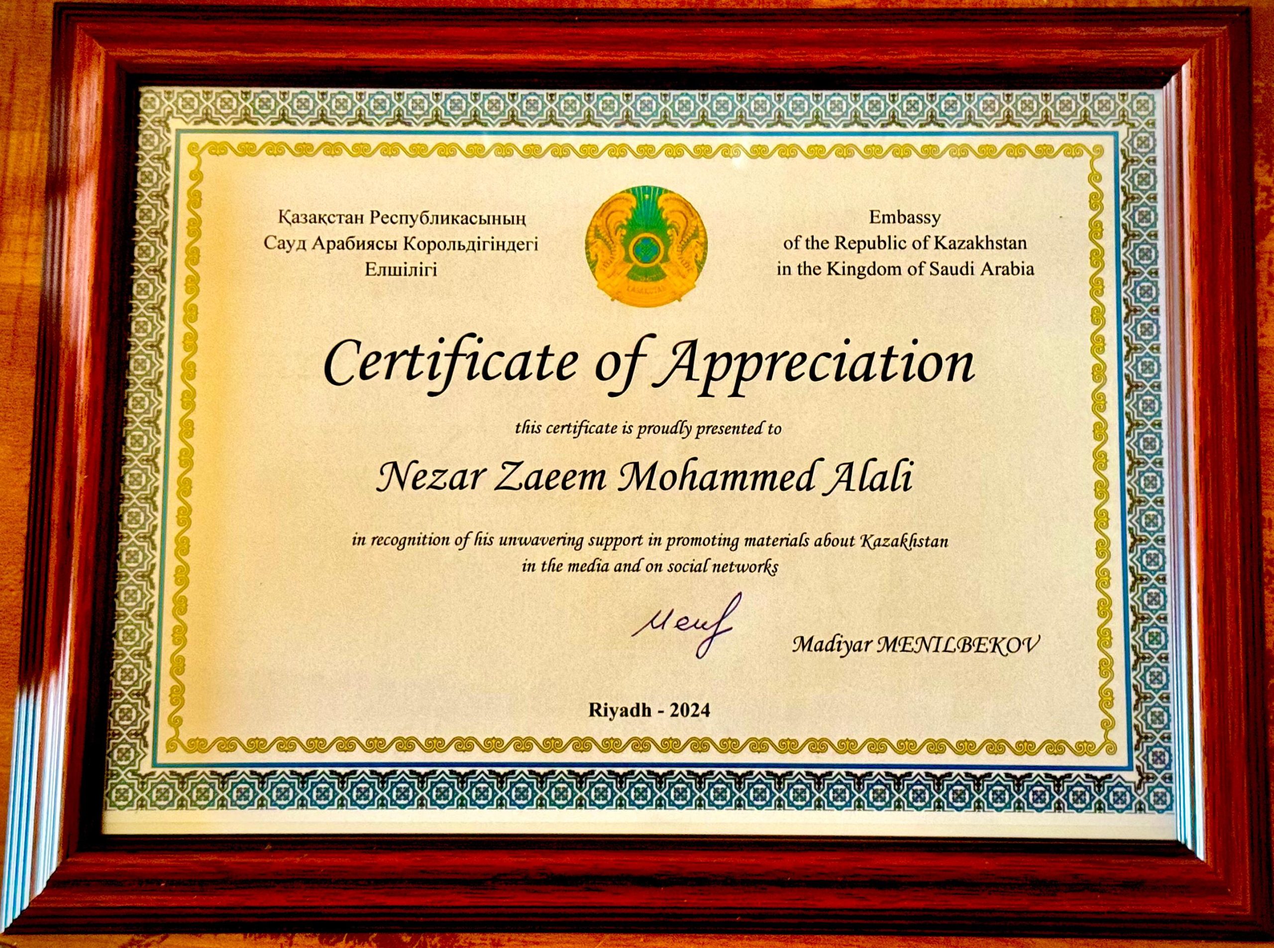 كرمت سفارة جمهورية كازاخستان بالرياض الاعلامي نزار العلي بجائزة التميز الاعلامي وقد قدم سعادة السفير ماديار مينيلبيكوف سفير جمهورية كازاخستان بالمملكة العربية السعودية شكره وتقديره الى الاعلامي نزار العلي نظير تميزه في التغطية الإعلامية الشاملة والموسعة لعدة مدن في كازاخستان وتسليط الضوء على السياحة والرياضة والثقافة العريقة لكازاخستان .