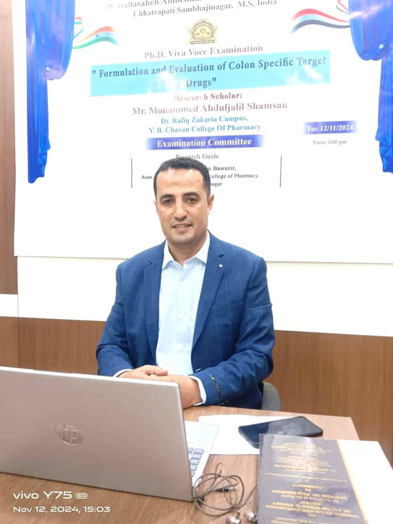 حصل الباحث محمد عبدالجليل عبدالله شمسان على درجة الدكتوراه بامتياز من جامعة بامو في الهند، عن أطروحته العلمية المتميزة التي حملت عنوان: “تطوير وتقييم الأدوية المستهدفة لأمراض القولون: دراسة تطبيقية على علاج الداساتينيب المدمج مع الكركم لعلاج سرطان القولون”.