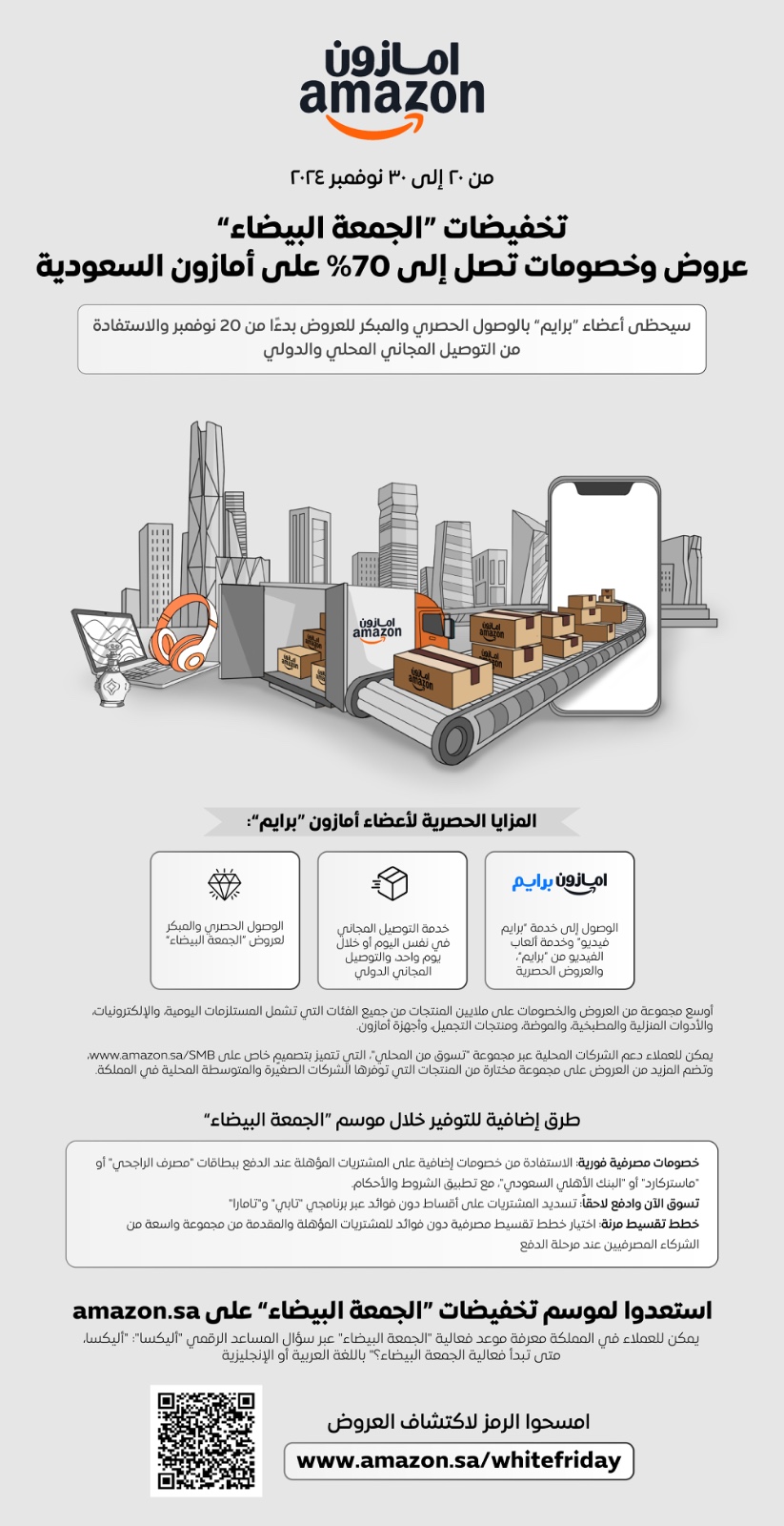 وبهذه المناسبة، قال، عبدو شلالا، مدير أمازون السعودية: “متحمسون لقدوم موسم تخفيضات الجمعة البيضاء وتقديم قيمة استثنائية لعملائنا في جميع أنحاء المملكة العربية السعودية، حيث يُعد موسم تخفيضات هذا العام أكبر وأفضل من أي وقت مضى، والوقت الأمثل للتسوق بالاستفادة من أوسع مجموعة من العروض والخصومات على ملايين المنتجات من جميع الفئات. نوفر في أمازون خيارات دفعٍ مرنة تشمل خيار “اشترِ الآن وادفع لاحقاً”، وخطط التقسيط البنكي بدون فوائد، إلى جانب خصوماتٍ مصرفية فورية، والتي تجعل التسوق أسهل من أي وقت مضى. بالإضافة إلى ذلك، سيتمتع أعضاء برنامج برايم في أمازون السعودية بتجربة تسوق حصرية والوصول المبكر إلى العروض، مع الاستفادة من توصيل سريع ومجاني، وعروض وقسائم خاصة. ندعو عملائنا وأعضاء أمازون برايم للاستمتاع بمزايا التسوق في أفضل موسمٍ لتخفيضات الجمعة البيضاء على الإطلاق!