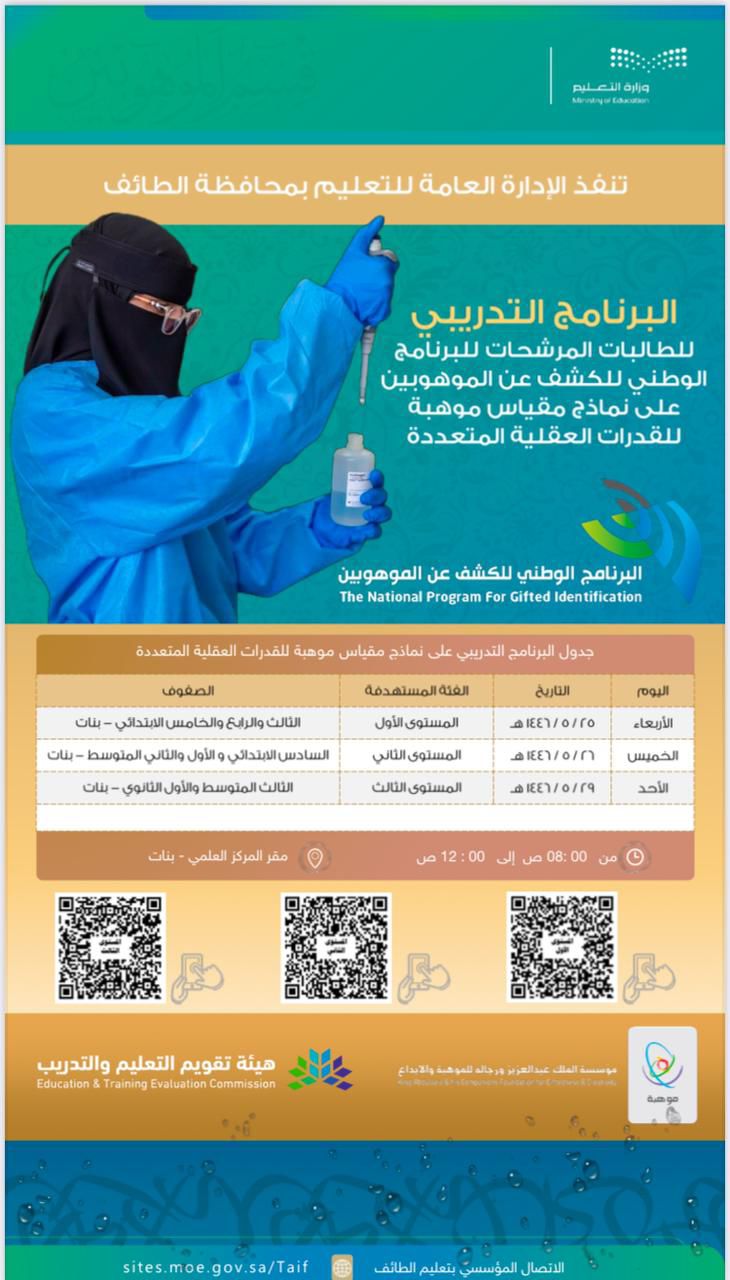 أطلقت الإدارة العامة للتعليم بمحافظة الطائف البرنامج التدريبي المخصص للطلاب المرشحين لاختبارات الكشف عن الموهوبين، بهدف تهيئتهم وتعزيز قدراتهم في مختلف المجالات. يهدف البرنامج إلى دعم الموهبة والإبداع واكتشاف الطاقات الواعدة، بما يتماشى مع رؤية المملكة 2030 لتعزيز الابتكار وتنمية القدرات البشرية وينطلق البرنامج المخصص للطالبات من غد الأربعاء والخميس ويوم الأحد صباحاً بالمركز العلمي بينما ينطلق البرنامج للبنين يوم الاثنين والثلاثاء والأربعاء صباحاً في مركز الموهوبين