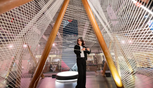 ويأخذ العمل الزوار في تجربة فريدة تربط بين التراث والممارسات اليومية، حيث تستحضر خطوط التصميم المبتكرة قصص البدو التي يحكيها السدو، بينما تبرز الخطوط الحادة المستوحاة من أشرعة الخيام؛ لتروي رحلة التطور عبر الزمن والمكان. كما تضفي شمس الصحراء وأهازيجها بُعدًا عاطفيًا يعيد إحياء ذاكرة الإنسان المرتبطة ببيئته، ليُصبح هذا العمل جسرًا بين الماضي والمستقبل، وبين الإنسان والكون.