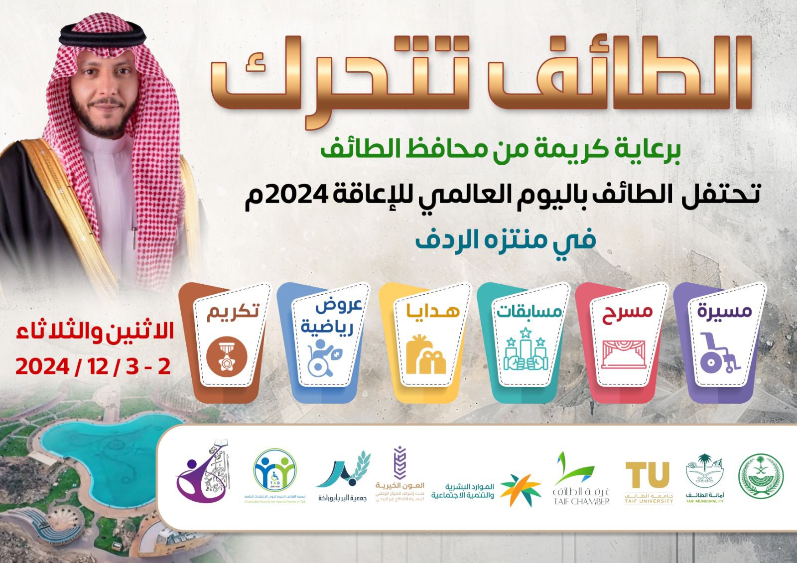 برعاية محافظ الطائف تطلق جمعية الطائف الخيرية لذوي الاحتياجات الخاصة يوم غدٍ الاثنين فعالية اليوم العالمي للإعاقة تحت شعار ” التمكين من اجل مستقبل شامل ومستدام ” بمنتزه الردف من خلال مبادرة الطائف تتحرك .