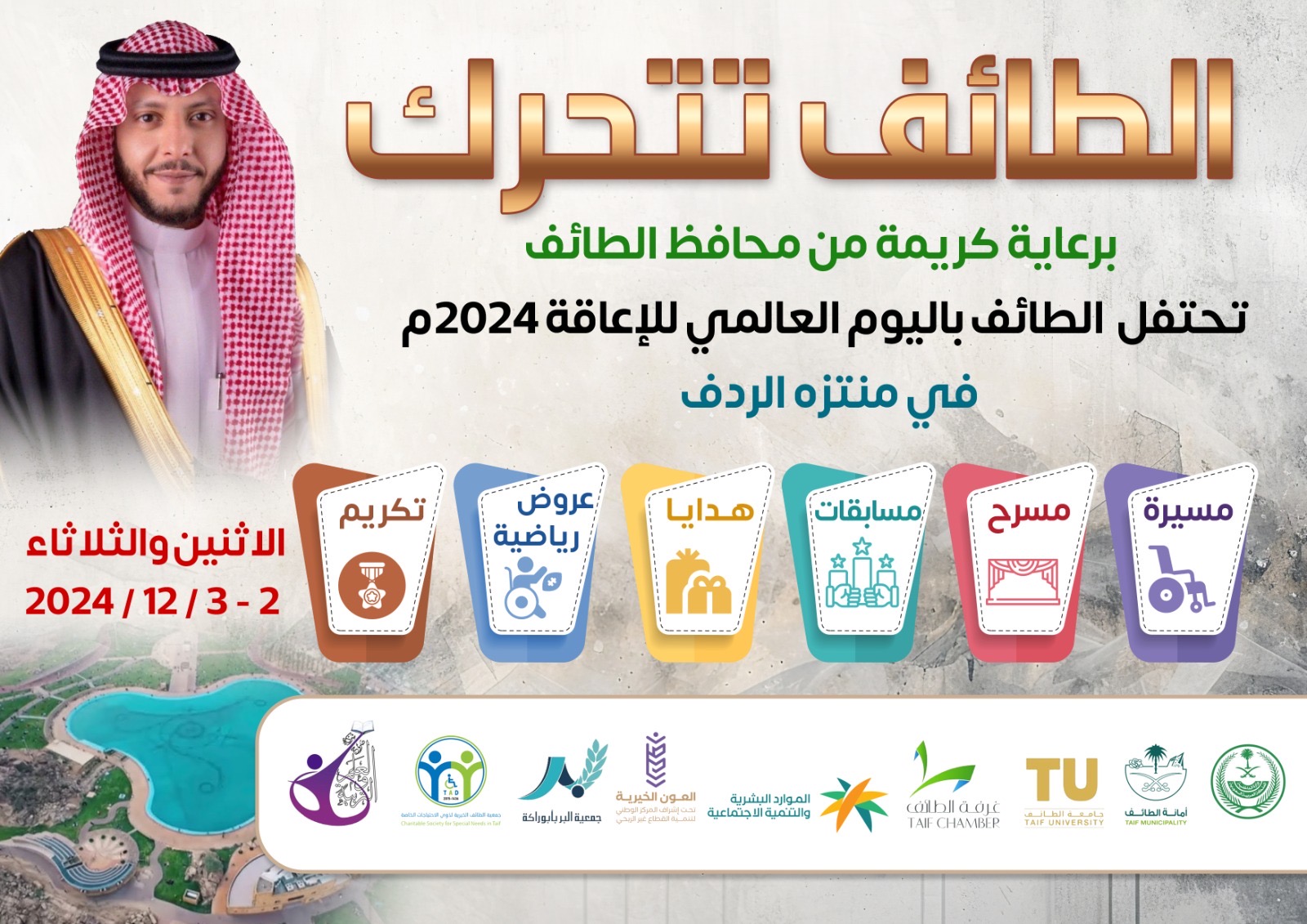 برعاية محافظ الطائف تطلق جمعية الطائف الخيرية لذوي الاحتياجات الخاصة اليوم الاثنين فعالية اليوم العالمي للإعاقة تحت شعار ” التمكين من اجل مستقبل شامل ومستدام ” بمنتزه الردف من خلال مبادرة الطائف تتحرك .