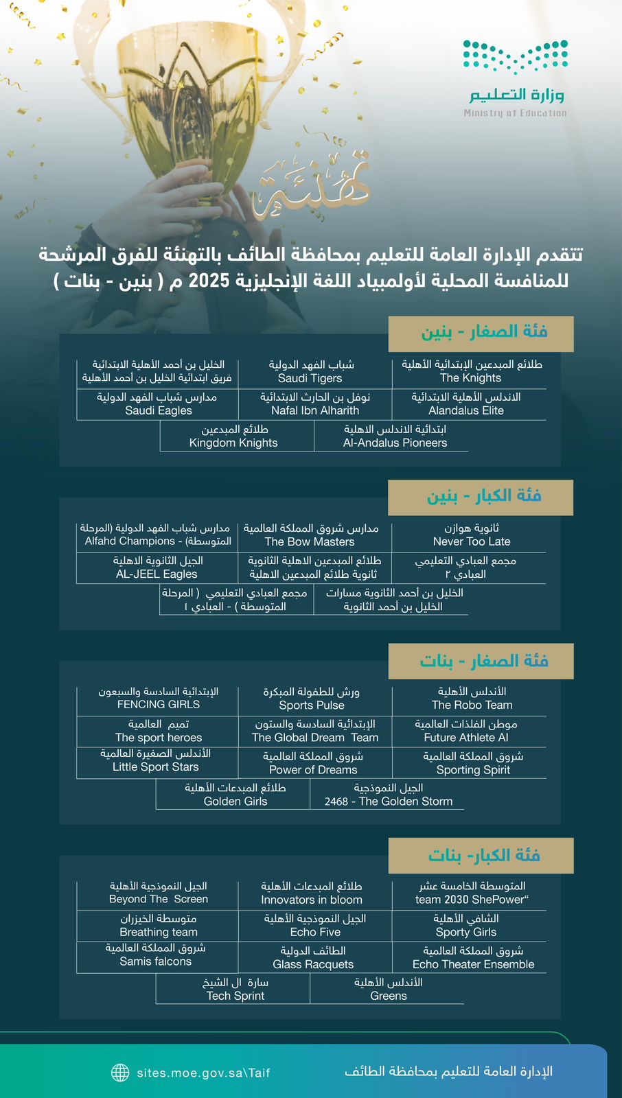 هنأت الإدارة العامة للتعليم بمحافظة الطائف الفرق المرشحة للمنافسة المحلية لأولمبياد اللغة الإنجليزية 2025 م ” بنين ،بنات”