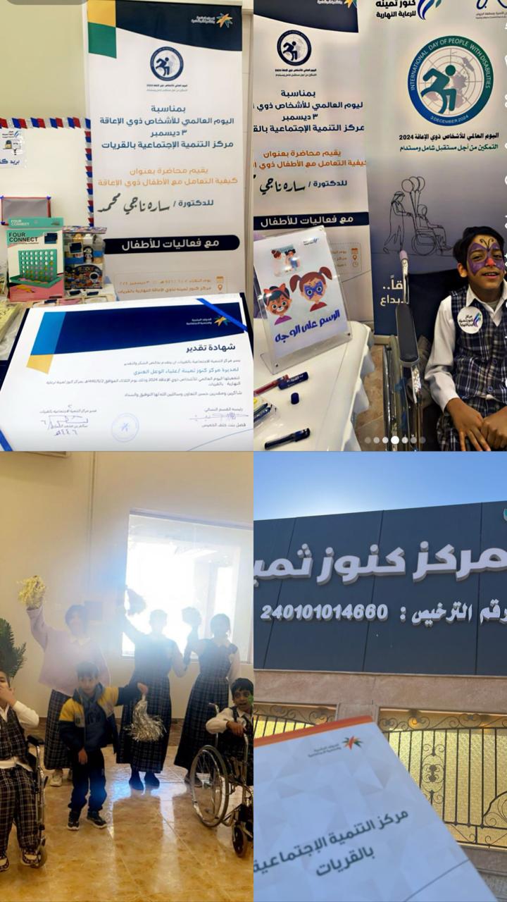 فعل مركز التنمية الاجتماعية بمحافظة القريات اليوم الثلاثاء 1446/6/2 اليوم العالمي للأشخاص ذوي الإعاقة بالشراكة مع مركز كنوز ثمينة للرعاية النهارية بالقريات ، وذلك ضمن برامج وأنشطة الأيام العالمية قدمتها الدكتورة/سارة ناجي ، قدمت فيها تعريف عن ذوي الإعاقة سواء سمعيه أو بصريه أو حركية أو عقلية ، وكيفية التعامل معهم من قبل الأهل وأهمية العلاج الطبيعي والإرشاد النفسي و الاندماج مع المجتمع ، وذكر بعض الشخصيات الملهمة من ذوي الإعاقه مثل المخترع إديسون والمؤلف السعودي سلطان العذل وغيرهم.