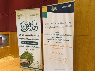 ملتقى التطوع بمناسبة اليوم العالمي للتطوع بحضور سعادة محافظ القريات الاستاذ/عبدالله بن صالح الجاسر وبحضور رؤساء الجمعيات وفرق التطوع بمحافظة القريات وكان من ضمن الملتقى كلمه لمدير مركز التنميه الاجتماعيه بالقريات الاستاذ/سالم بن محمد الشراري وكلمه لرئيس جمعية اللبر الخيريه بالقريات الدكتور/مشعل العنزي