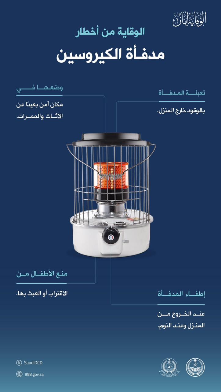 أكدت المديرية العامة للدفاع المدني على إتباع إجراءات السلامة عند استخدام مدفأة الكيروسين، وشددت على ضرورة تعبئة المدفأة بالوقود خارج المنزل، ومنع الأطفال من الاقتراب أو العبث بها، وإطفاءها عند الخروج من المنزل أو عند النوم، ووضعها في مكان آمن وبعيد عن الأثاث والممرات.