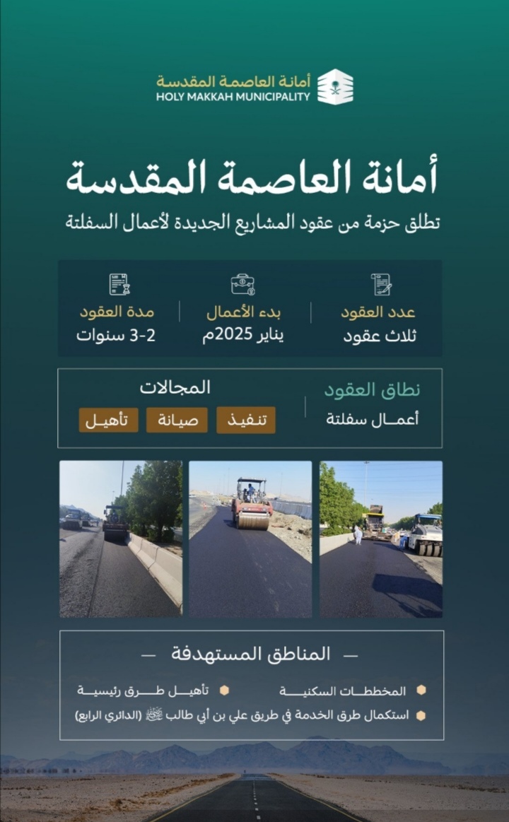 أعلنت أمانة العاصمة المقدسة عن إطلاق حزمة من عقود المشاريع الجديدة لأعمال السفلتة، تشمل تنفيذ، وصيانة، وتأهيل الطرق في مختلف أنحاء مكة، وذلك بهدف تحسين جودة البنية التحتية وتلبية احتياجات التطوير الحضري، وتركزت العقود على تنفيذ أعمال السفلتة في المخططات السكنية، إلى جانب التأهيل لطرق رئيسية، بالإضافة الى استكمال تطوير طرق الخدمة في طريق علي بن أبي طالب (الدائري الرابع) بما يعزز من كفاءة النقل والخدمات المرتبطة به، ومما يعكس التزام الأمانة برفع كفاءة شبكة الطرق وتحسين وضمان سلامة الحركة المرورية .