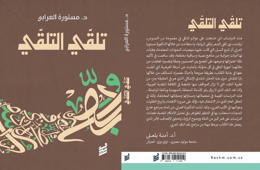 عن دار رشم للنشر والتوزيع أصدرت الشاعرة والناقدة الدكتورة مستورة العرابي أستاذ فلسفة الأدب والنقد الحديث بجامعة الطائف كتاب ( تلقّي التلقّي ) والذي يقع في حوالي 200 صفحة ويتكون من ثلاثة فصول في نقد النقد في الشعر والرواية . وحظي معرض جده للكتاب بحضور الكتاب والذي حظي حفل توقيعه بحضور شخصيات بارزة وشخصيات ثقافية وأدبية وإعلامية وعلى رأسهم وزير الإعلام السابق معالي الدكتور عبدالعزيز خوجه.