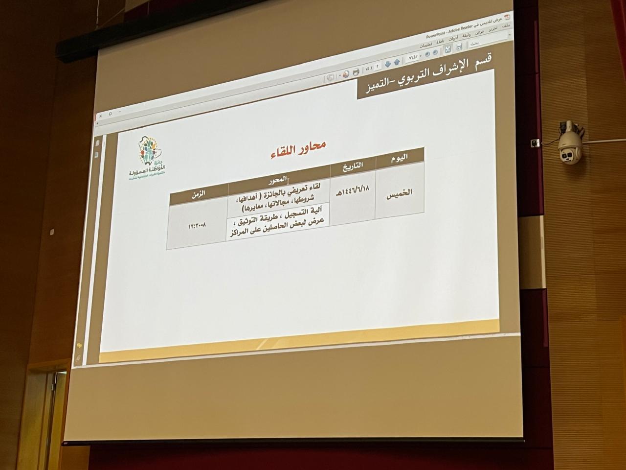 وعُنيت الورشة في محاورها بالتعريف بالجائزة وشروطها وأهدافها ومجالاتها ونطاق تطبيقها مع ذكر مكوناتها وأمثلة على المشاركات في مجالات الجائزة، تلا ذلك شرح لآلية الإخراج والتوثيق في القوالب والرفع على موقع الجائزة.