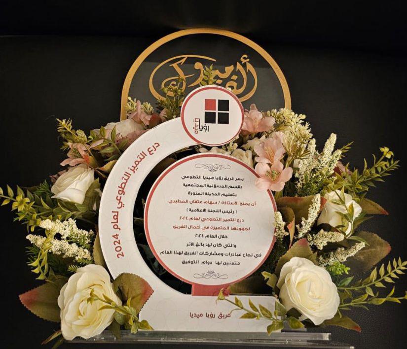 منح رئيس فريق رؤيا ميديا التطوعي الأستاذ : بدر الحجيلي بقسم المسؤولية المجتمعية بتعليم المدينة الأستاذة : سهام عتقان المطيري – رئيسة اللجنة الإعلامية للفريق – “درع التميز التطوعي 2024” بحضور الأستاذ : عبدالله القرني مدير إدارة التطوع في إدارة التعليم ، وأعضاء الفريق ، نظير جهودها المتميزة ومشاركاتها الفعالة في أعمال الفريق مما كان له الأثر الواضح في إنجاحها.