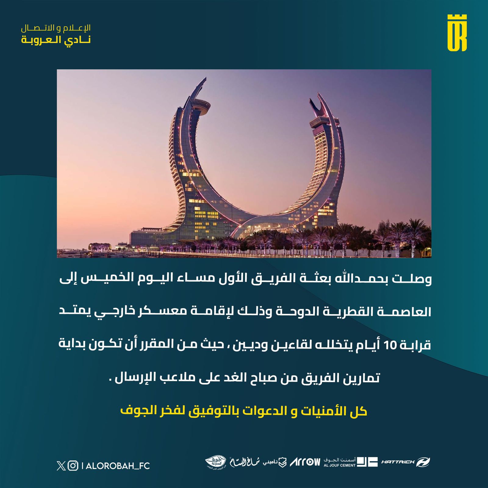 وصلت بعثة الفريق الأول لنادي العروبة مساء أمس الخميس إلى العاصمة القطرية الدوحة ،وذلك لأقامة معسكر خارجي يمتد قرابة 10أيام .