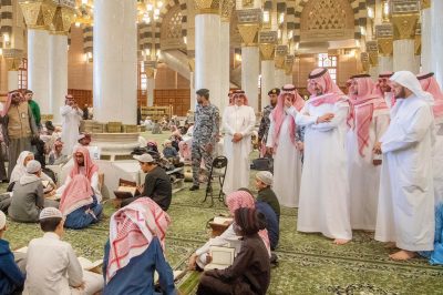 وكان سمو أمير منطقة المدينة المنورة قد قام بزيارة تفقدية لحلقات القرآن الكريم والمتون العلمية في رحاب المسجد النبوي، بحضور المشرف العام على الحلقات، فضيلة الشيخ الدكتور: عبدالمحسن القاسم، إمام وخطيب المسجد النبوي، واطلع سموه على الحلقات وخِدمات مُدارسة القرآن الكريم وتلقي علومه.