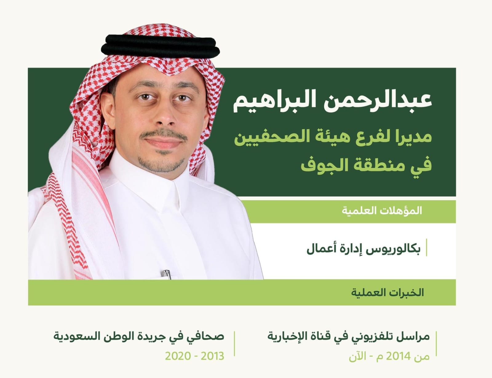 صدر قرار سعادة الأستاذ عضوان بن محمد الأحمري رئيس مجلس إدارة هيئة الصحفيين السعوديين المتضمن تعيين الأستاذ عبد الرحمن البراهيم مديراً لفرع هيئة الصحفيين السعوديين في منطقة الجوف