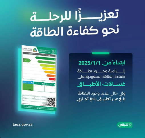أعلن المركز السعودي لكفاءة الطاقة البدء بإلزامية بطاقة كفاءة الطاقة على غسالات الأطباق لدى جميع منافذ البيع في المملكة وذلك بدءًا من 1 يناير 2025م ، مهيبًا بالمستهلكين الراغبين في شراء هذا النوع من الأجهزة التأكد من وجود هذه البطاقة على الجهاز والإبلاغ في حال عدم وجودها عبر تطبيق “بلاغ تجاري”.