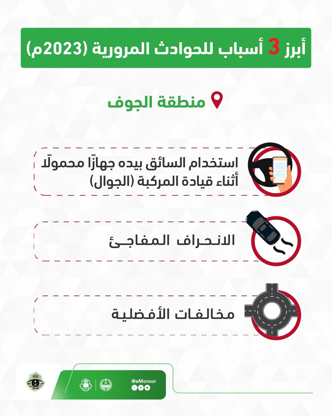 كشفت الإدارة العامة للمرور عن أبرز (3) مسببات للحوادث المرورية في عام 2023 في منطقة الجوف.