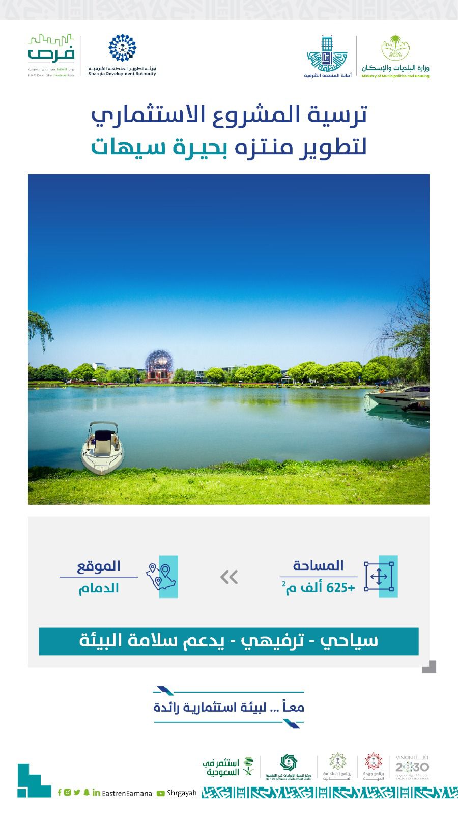 أعلنت أمانة المنطقة الشرقية، عن ترسية المشروع الاستثماري لإنشاء وتطوير وتشغيل واستثمار بحيرة سيهات كمنتزه سياحي وترفيهي ويهدف المشروع للارتقاء بالخدمات الترفيهية والسياحية مما يعزز من عناصر جودة الحياة.