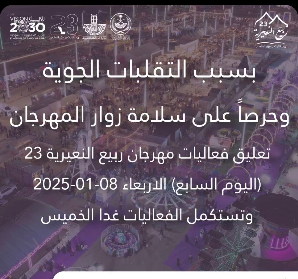 وفي منشور للمهرجان ذكروا أنه بسبب التقلبات الجوية وحرصا على سلامة زوار المهرجان، تعليق فعاليات مهرجان ربيع النعيرية 23 ( اليوم السابع ) الأربعاء 8 يناير 2025م وتستكمل الفعاليات غداً الخميس.