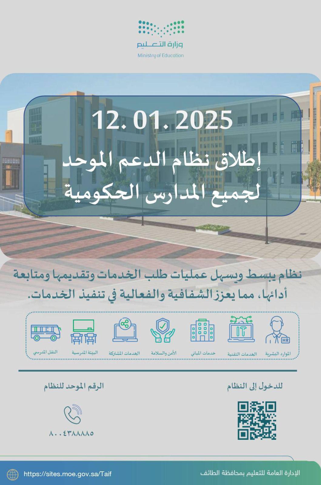 انطلق اليوم الأحد نظام الدعم الموحد في أكثر من 1700 مدرسة حكومية للبنين والبنات في الإدارة العامة للتعليم بالطائف. وأكد الدكتور سعيد بن عبدالله الغامدي، المدير العام للتعليم بالطائف، أن هذا النظام يأتي في إطار جهود وزارة التعليم لتعزيز التحول الرقمي وتطوير البيئة التعليمية.
