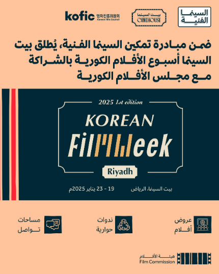 وفي خطوة جديدة ضمن مبادرة «تمكين السينما الفنية»، تنطلق فعاليات أسبوع السينما الكورية بدعم من هيئة الأفلام للمرة الأولى في العاصمة الرياض، خلال الفترة من 19 إلى 23 يناير 2025م، في «بيت السينما»، وتهدف هذه الفعالية إلى تقديم تجربة سينمائية مختلفة تعكس تنوّع وعمق الثقافة الكورية، وتعزز التفاعل الثقافي بين المملكة وكوريا.