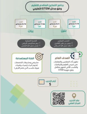 من جانب آخر و ضمن مشروع “التمكين المتقدم للتعليم وفق مدخل STEM التعليمي” والذي يهدف لتطوير أداء المعلمين والمعلمات في تدريس مواد (العلوم والرياضيات والحاسب الآلي) كمنهج متكامل وفق منهجية STEM . ُيستأنف البرنامج التدريبي للأسبوع الثاني والذي بدأ الأسبوع الماضي ويستمر لمدة شهر في مقر المركز العلمي تحت إشراف إدارة الموارد البشرية ممثلة في فريق التدريب التربوي وبتنفيذ ومتابعة من إدارة أداء التعليم ممثلة في قسم الإشراف التربوي، والذي يهدف لتدريب أكثر من 100 مشرف ومشرفة للمواد المستهدفة .