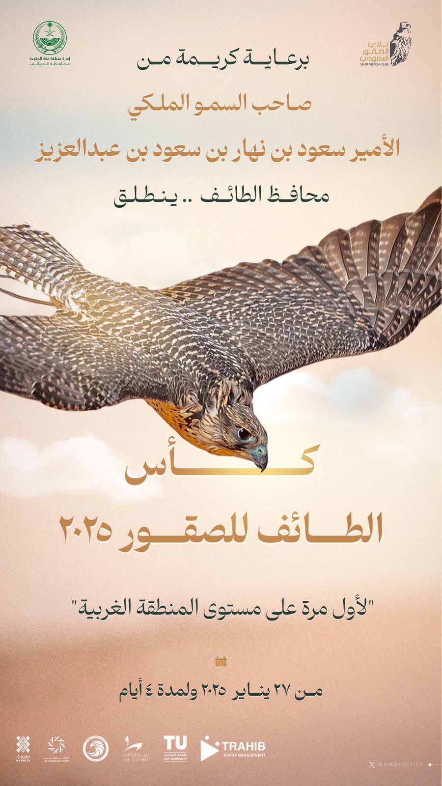 تحت رعاية صاحب السمو الملكي الأمير سعود بن نهار بن سعود بن عبدالعزيز، محافظ الطائف، تنطلق غدًا الإثنين بطولة كأس الطائف للصقور، في سوق عكاظ التاريخي. وتستمر فعاليات البطولة على مدار خمسة أيام، في الفترة من 27 إلى 31 يناير، لتجمع بين التراث والثقافة في أجواء رياضية مميزة.