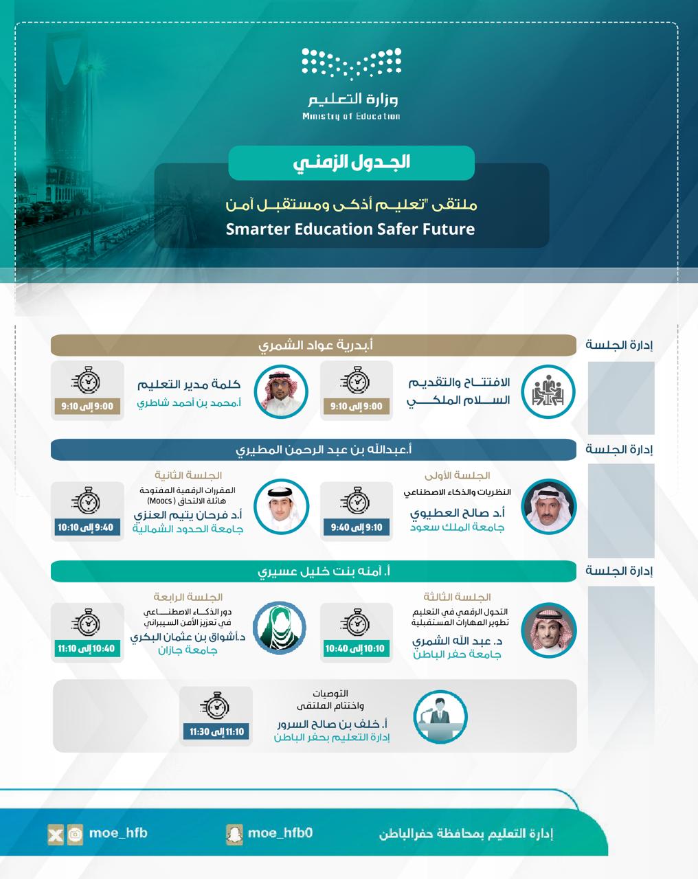 برعاية مدير التعليم بمحافظ حفرالباطن الأستاذ محمد بن أحمد شاطري عقد ملتقى ” تعليم ذكي ومستقبل آمن” بتنظيم من قسم التطوير والنحول برئاسة الأستاذة عمشاء بنت زايد الشمري وبمشاركة نخبة من المختصين والأكاديمين بالمملكة ، وافتتح الملتقى بالسلام الملكي ثم ألقى مدير تعليم حفر الباطن أحمد شاطري كلمة رحب فيها بالحضور والمشاركين مؤكداً بالوقت نفسه على أهمية الملتقى وما يعود على الجميع من نفع ، ثم اتاحت مقدمة الحفل الأستاذة بدرية الشمري لافتتاح الجلسات والتي بدأت بالجلسة الأولى للأستاذ الدكتور صالح العطيوي من جامعة الملك سعود بعنوان ” النظريات والذكاء الاصطناعي ” والجلسة الثانية للأستاذ الدكتور فرحان يتيم العنزي من جامعة الحدود الشمالية بعنوان ” الفقرات الرقمية المفتوحة ” وأدار الجلستان الأستاذ عبدالله بن عبدالرحمن المطيري .