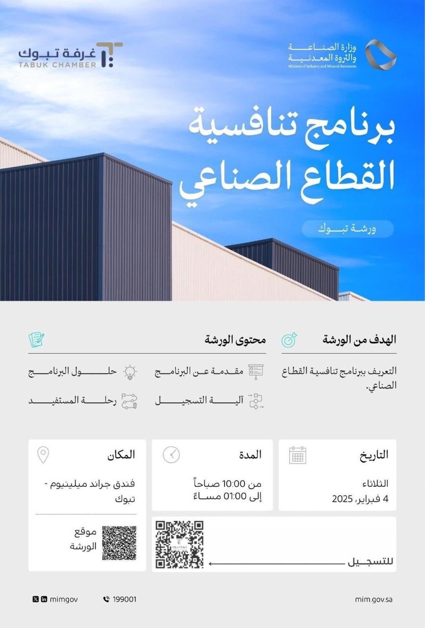 تدعوكم غرفة تبوك ممثلة باللجنة الصناعية لحضور ورشة عمل ( برنامج تنافسية القطاع الصناعي ) والتي تنظمها وزارة الصناعة للتعريف بالبرنامج والحلول التي يقدمها لدعم وتمكين تنافسية القطاع الصناعي وتعزيز قدرته التنافسية، بما يساهم في تحقيق مستهدفات رؤية السعودية 2030 نحو تطوير القطاع الصناعي وزيادة مساهمته في الاقتصاد الوطني.