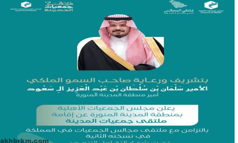 تحت رعاية صاحب السمو الملكي الأمير سلمان بن سلطان بن عبد العزيز آل سعود، أمير منطقة المدينة المنورة، يستعد مجلس الجمعيات الأهلية بمنطقة المدينة المنورة لإطلاق ملتقى جمعيات المدينة بالتزامن مع ملتقى مجالس الجمعيات الأهلية في المملكة بنسخته الثانية، تحت شعار “التكامل التنموي”، وذلك يومي 11 و12 فبراير في الغرفة التجارية بالمدينة المنورة.