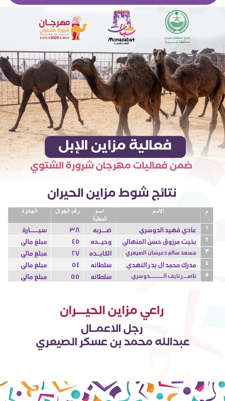 أعلن مهرجان شرورة الشتوي نتائج شوط مزاين الحيران والراعي مزاين الحيران رجل الأعمال عبدالله بن محمد بن عسكر الصيعري