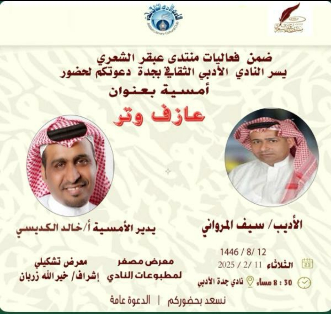 يقيم منتدى عبقر الشعري بالنادي الأدبي بجدة مساء غدا الثلاثاء، 12 /8 /1446 أمسية شعرية بعنوان عازف وتر للشاعر سيف المرواني ويديرالأمسية الشاعر خالدالكديسي نائب رئيس منتدى عبقرالشعري، عند الساعة الثامنة والنصف مساء بقاعة مكتبة النادي كما يصاحب الأمسية معرض مصغر للكتب و معرض تشكيلي من أشراف الاستاذخيرالله زربان.