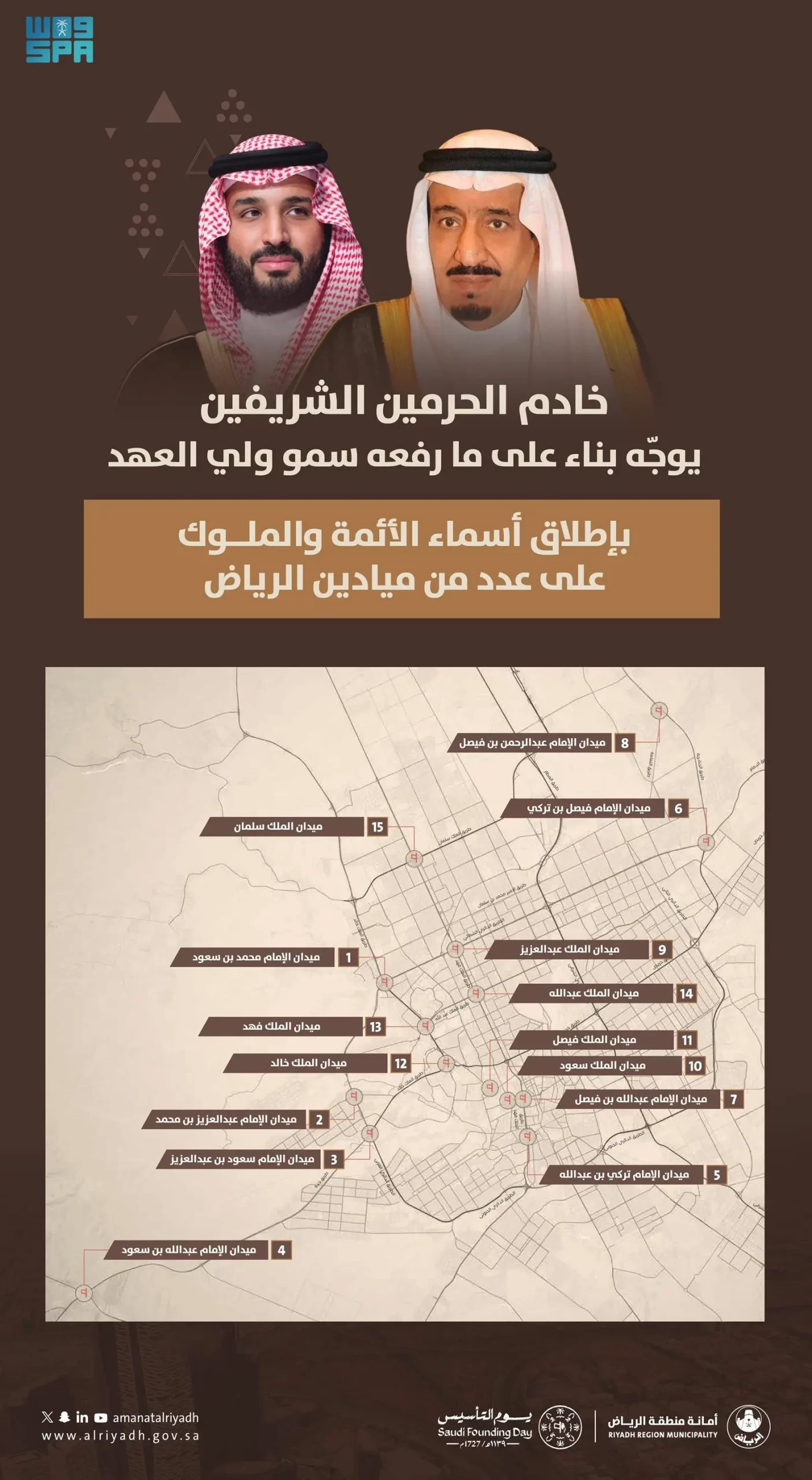 تخليدًا لذكرى أئمة وملوك الدولة السعودية؛ وجه خادم الحرمين الشريفين الملك سلمان بن عبدالعزيز آل سعود -أيده الله- بناءً على ما رفعه صاحب السمو الملكي الأمير محمد بن سلمان بن عبدالعزيز آل سعود ولي العهد رئيس مجلس الوزراء حفظه الله ، بإطلاق أسماء أئمة وملوك الدولة على 15 ميدانًا بمدينة الرياض، وذلك تزامنًا مع احتفاء المملكة العربية السعودية بيوم التأسيس الذي يوافق 22 فبراير من كل عام.