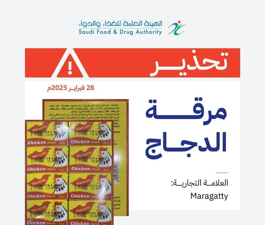 أصدرت الهيئة العامة للغذاء والدواء تحذيرًا من منتج مرقة الدجاج للعلامة التجارية (Maragatty)، بلد المنشأ: جمهورية مصر العربية، والمعبأ في عبوات تزن 480 جرامًا، ويحمل تاريخ صلاحية 1/11/2026، وذلك لاحتوائه على ألوان صناعية محظورة (Dimethy1 Yellow, Sudan I, Sudan IV)، التي يُمنع استخدامها في المنتجات الغذائية لما قد تسببه من آثار سلبية على صحة المستهلك.