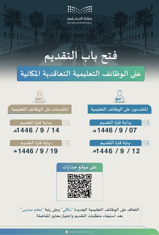 ويبدأ التقديم على الوظائف التعليمية اعتبارًا من يوم الجمعة 07 مارس 2025م، الموافق 07 رمضان 1446هـ للمتقدمين وينتهي بنهاية يوم الأربعاء 12 مـارس 2025 الموافق 12 رمضان 1446 هـ، وللمتقدمات يوم الجمعة بتاريخ 14 مارس 2025م الموافق 14 رمضان 1446هـ، وينتهي بنهاية يوم الأربعاء 19 مارس 2025م الموافق 19 رمضان 1446هـ، وذلك وفقًا للائحة التنفيذية للموارد البشرية في الخدمة المدنية.