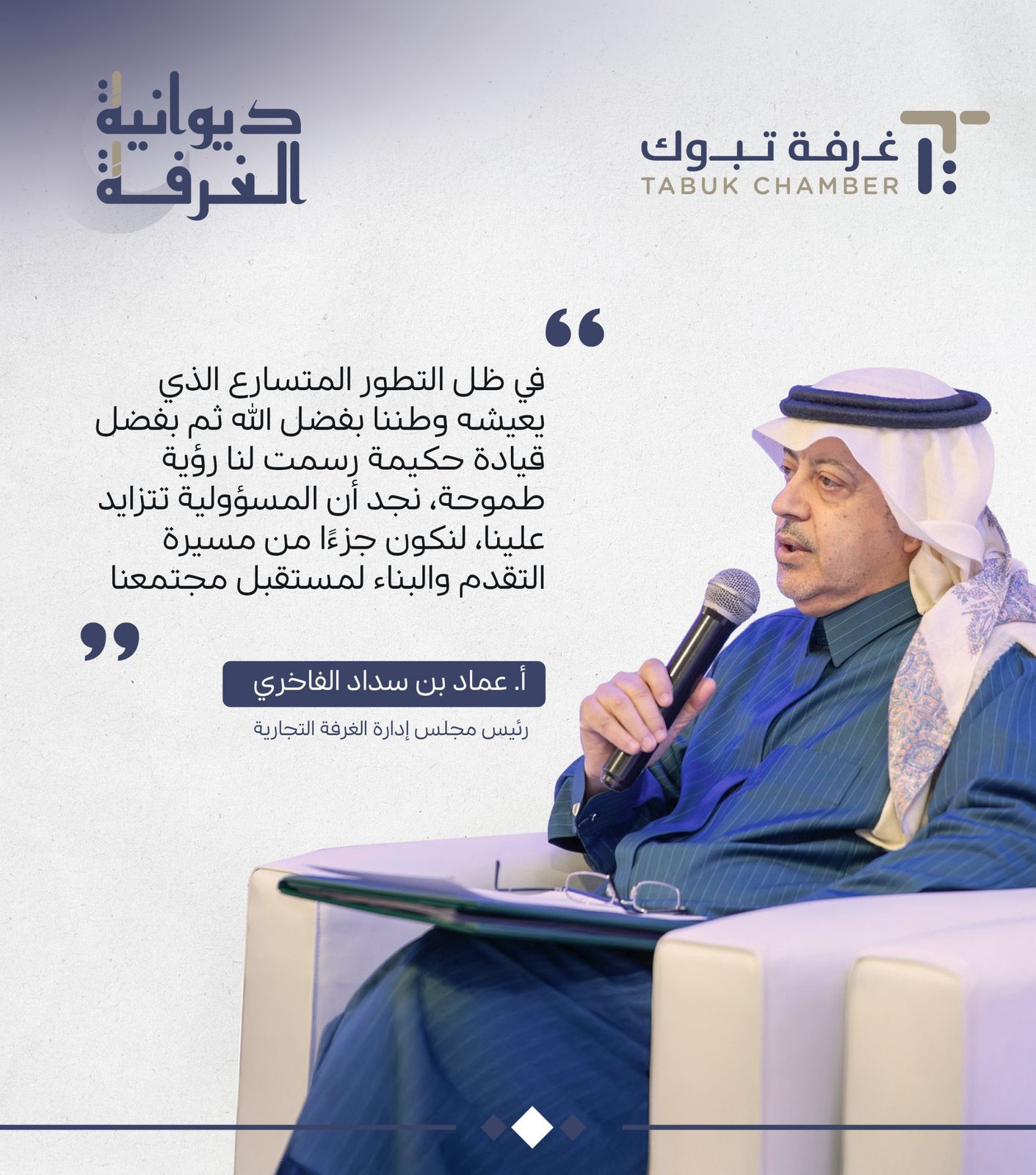 دشن رئيس مجلس إدارة غرفة تبوك أ.عماد بن سداد الفاخري، أمس، فعاليات ” ديوانية الغرفة “، بحضور نخبة من رجال وسيدات الأعمال وأعضاء مجلس الإدارة ورؤساء اللجان القطاعية بالغرفة، وعدد من الهمتمين بالشأن الإقتصادي بالمنطقة.