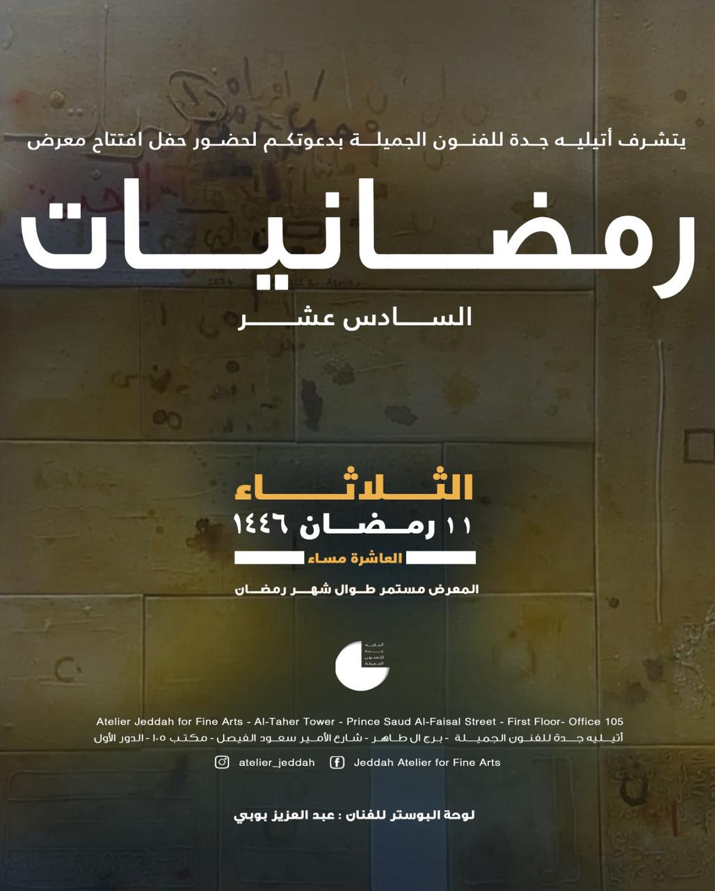 ينظم أتيليه جدةً للفنون الجميلة معرضه الأشهر رمضانيات بمشاركة نخبة من الفنانين السعوديين والعرب يوم الثلاثاء المقبل ويفتتح المعرض رجل الأعمال السعودي سعد المغربي ويستمر المعرض حتي نهاية الشهر الفضيل ،وقال هشام قنديل أن معظم الأعمال المشاركة مستلهمة من روح الحضارة والفنون الإسلامية، وعكست رؤى فكرية متنوعة، وجسدت العمارة والزخارف الإسلامية، ومنها أعمال بالخط العربي تعبّر عن روحانيات شهر رمضان، فضلاً عن بعض الآيات القرآنية.