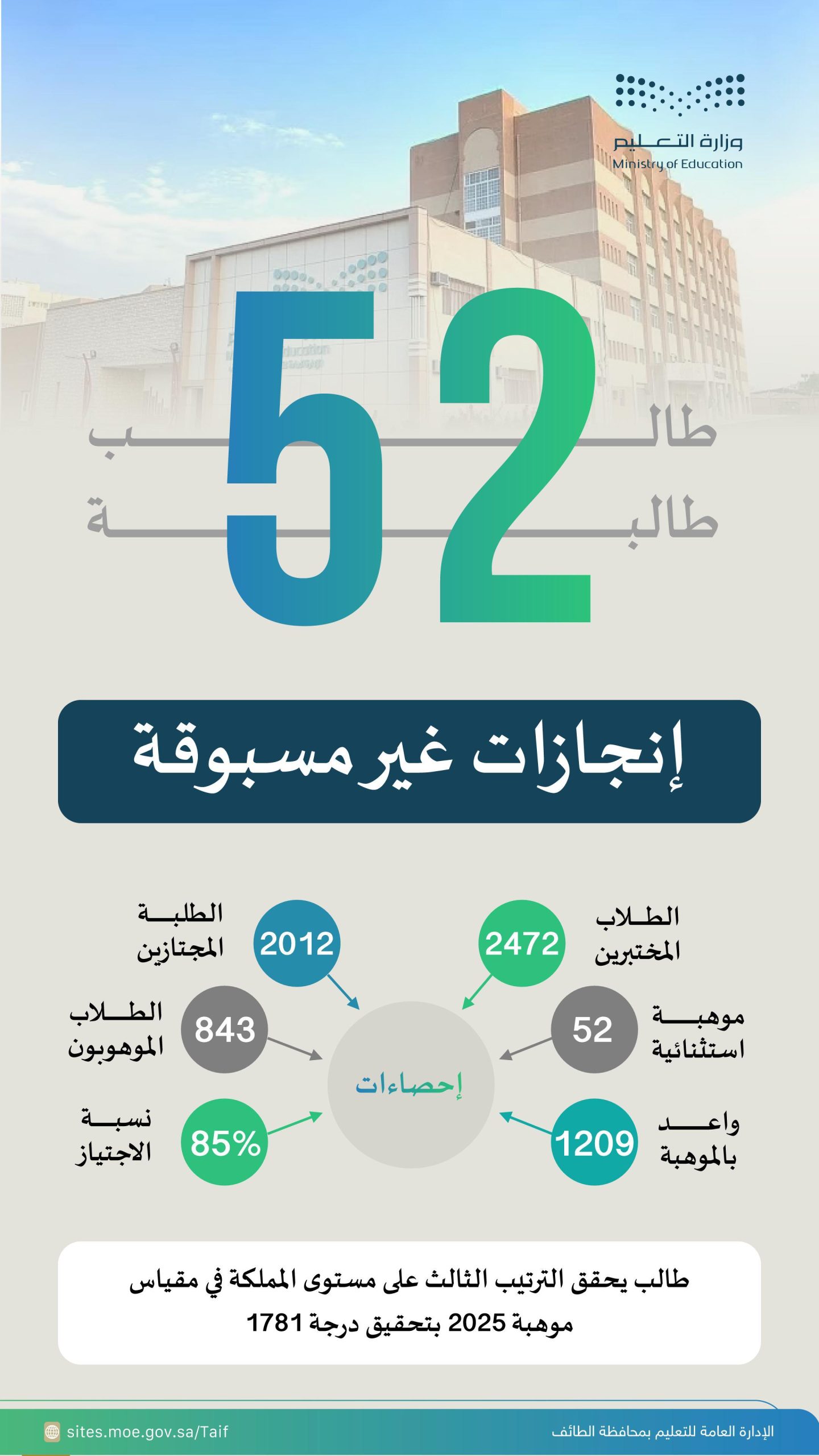 في مقياس موهبة 2025 بتحقيق 1781 درجة وقدَّم المدير العام للتعليم بالطائف الدكتور سعيد بن عبدالله الغامدي مباركته للطلاب والطالبات وأسرهم ومدارسهم على تحقيقهم هذا المنجز النوعي في مقياس موهبة، الذي يبرز الجهود المميزة المبذولة في الميدان التعليمي من قبل مديري ومديرات المدارس والمعلمين مشيدًا بالأدوار الرئيسية التي قام بها الزملاء والزميلات معلمو الموهوبين في المدارس و مثمنًا كذلك جهود أولياء الأمور، ومتابعتهم الدائمة بما يحقق التكامل بين الأسرة والمدرسة، مشيداً بدور الشؤون التعليمية إدارة تنمية القدرات قسم الموهوبين في هذا الجانب