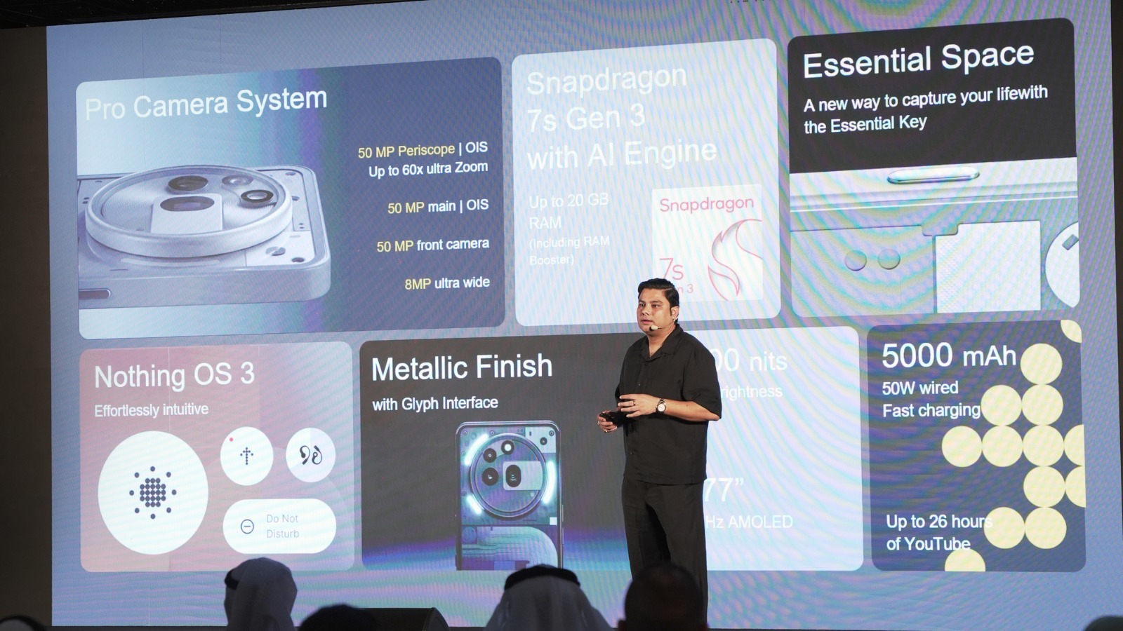 استضاف الحدث العديد من الخبراء والمتحدثين في هذا المجال، ومن أبرزهم أحمد الزرعوني، الخبير الإماراتي في تقنية المعلومات والأمن السيبراني، الذي شارك برؤى ثاقبة حول ميزة Essential Space المبتكرة في هاتف Nothing Phone (3a)، وأنتيكا حسام، صانعة المحتوى والمصورة التي قدمت النصائح العملية لتعزيز الاستفادة من إمكانات سلسلة هواتف Nothing Phone (3a)، وفيصل بوعفره، العضو الإماراتي في مجتمع Nothing الذي شارك قصته مع Nothing وشغفه وحبه للعلامة التجارية.